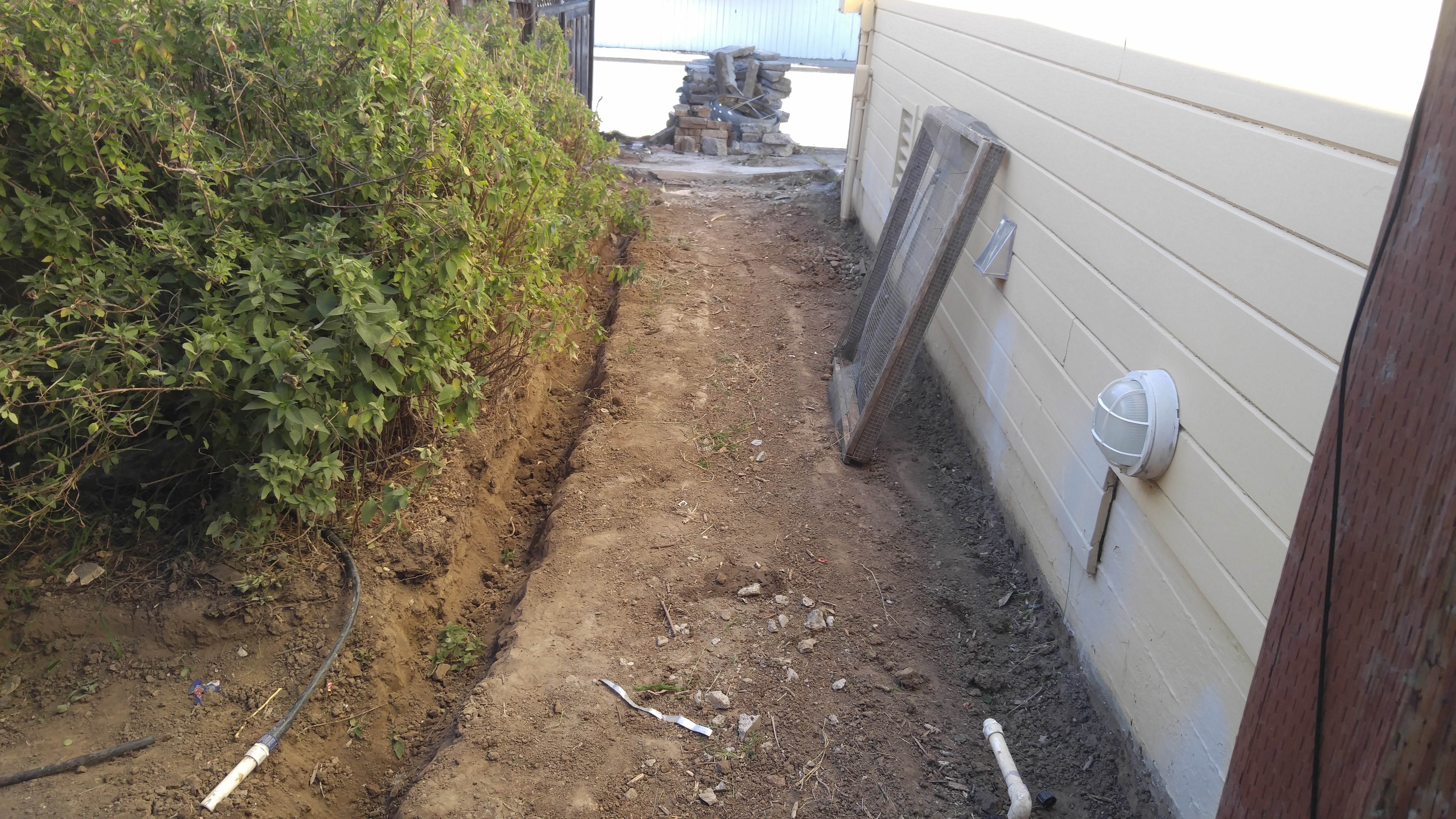 Flower bed removed, drain line dug, the rest of the gas trench dug, space cleared for the slab for the pumps and the heater (and I checked, and we need more space than the documentation said). Didn't get forms built, but calling it a day. Need to sort permit issues this week for replacing the sidewalk to run the drain under it and expand the driveway apron. Maybe build forms in an evening this week, and hope the slab permit comes through shortly...