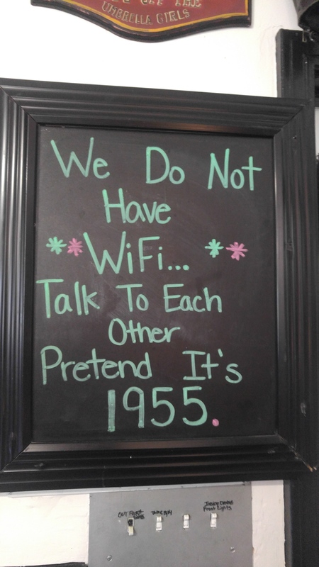 "We do not have WiFi. Talk to each other. Pretend it's 1955." Except that there are some social wrongs in which I will not participate...