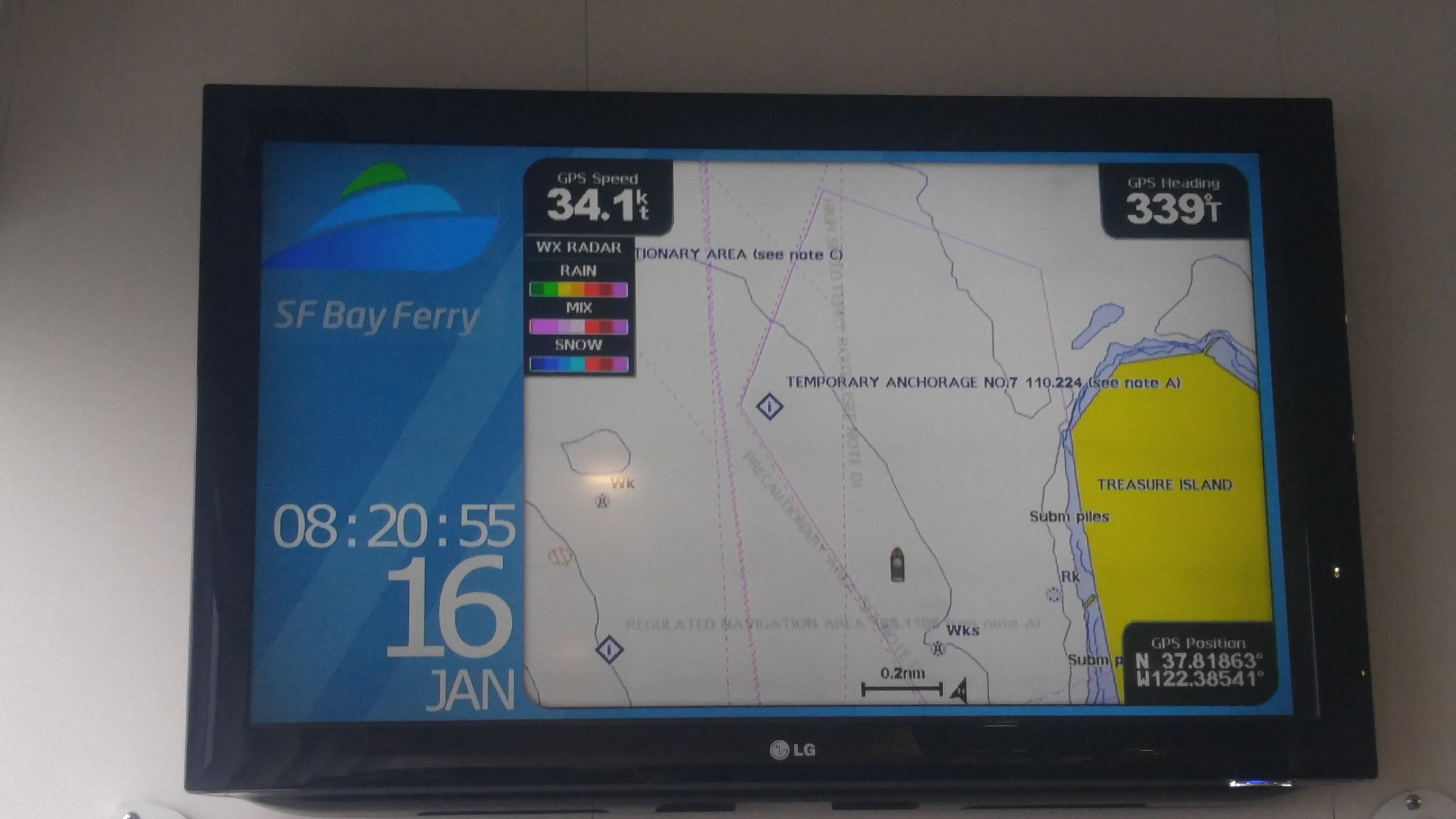 Riding the ferry up to Vallejo to get my truck. The bay is foggy and grey, but the chart of current location is pretty cool.