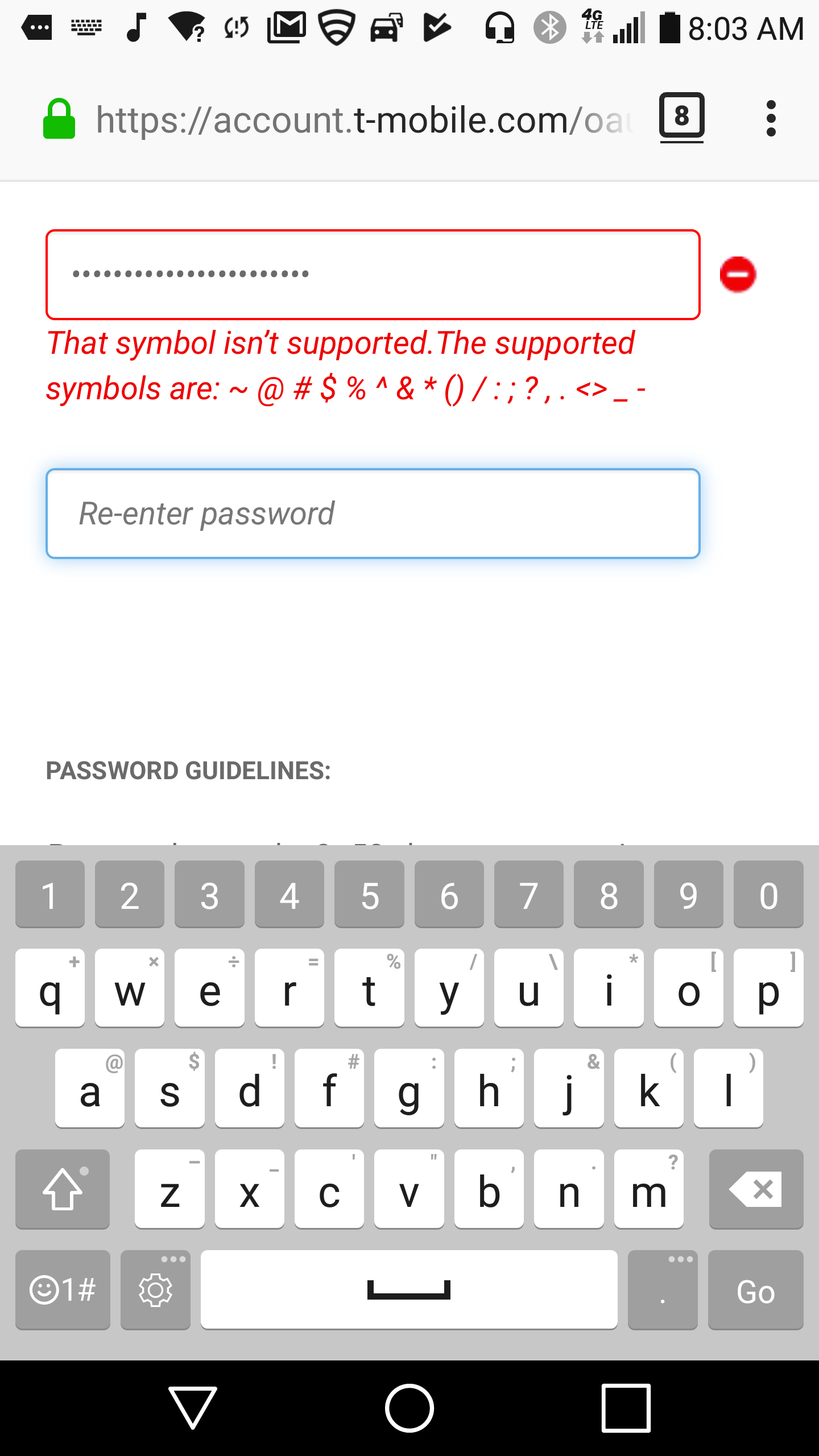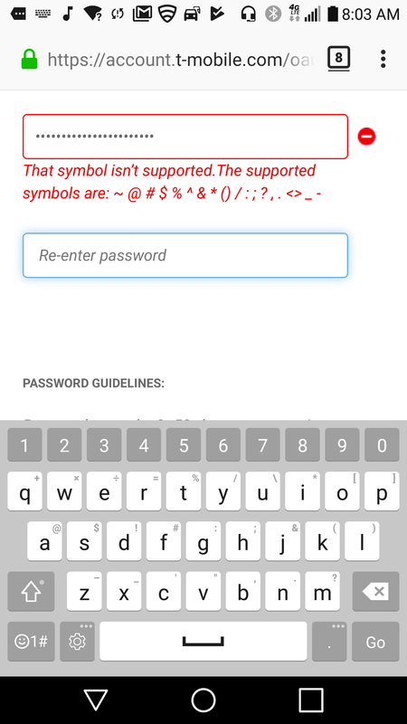 Really? That's a standard ASCII character. T-Mobile doesn't trust that their database inputs are sanitized. Not a confidence builder...
