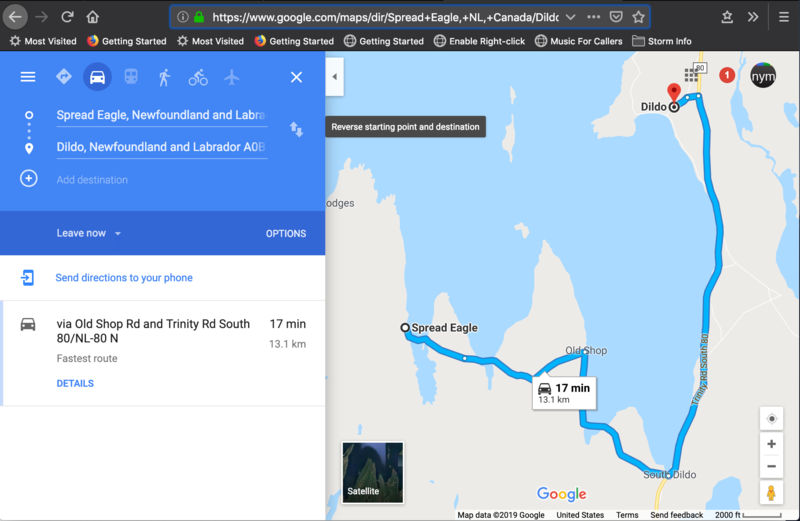 Spread Eagle to Dildo (Newfoundland). The best part is the popover.https://www.google.com/maps/dir/Spread+Eagle,+NL,+Canada/Dildo,+NL+A0B+1P0,+Canada/@47.5447094,-53.6146111,13z/data=!4m14!4m13!1m5!1m1!1s0x4b73309a4803b9f9:0x9880848236d957af!2m2!1d-53.613297!2d47.538612!1m5!1m1!1s0x4b73373f77e942bd:0x435c8ad09adc12c!2m2!1d-53.5555661!2d47.5706202!3e0