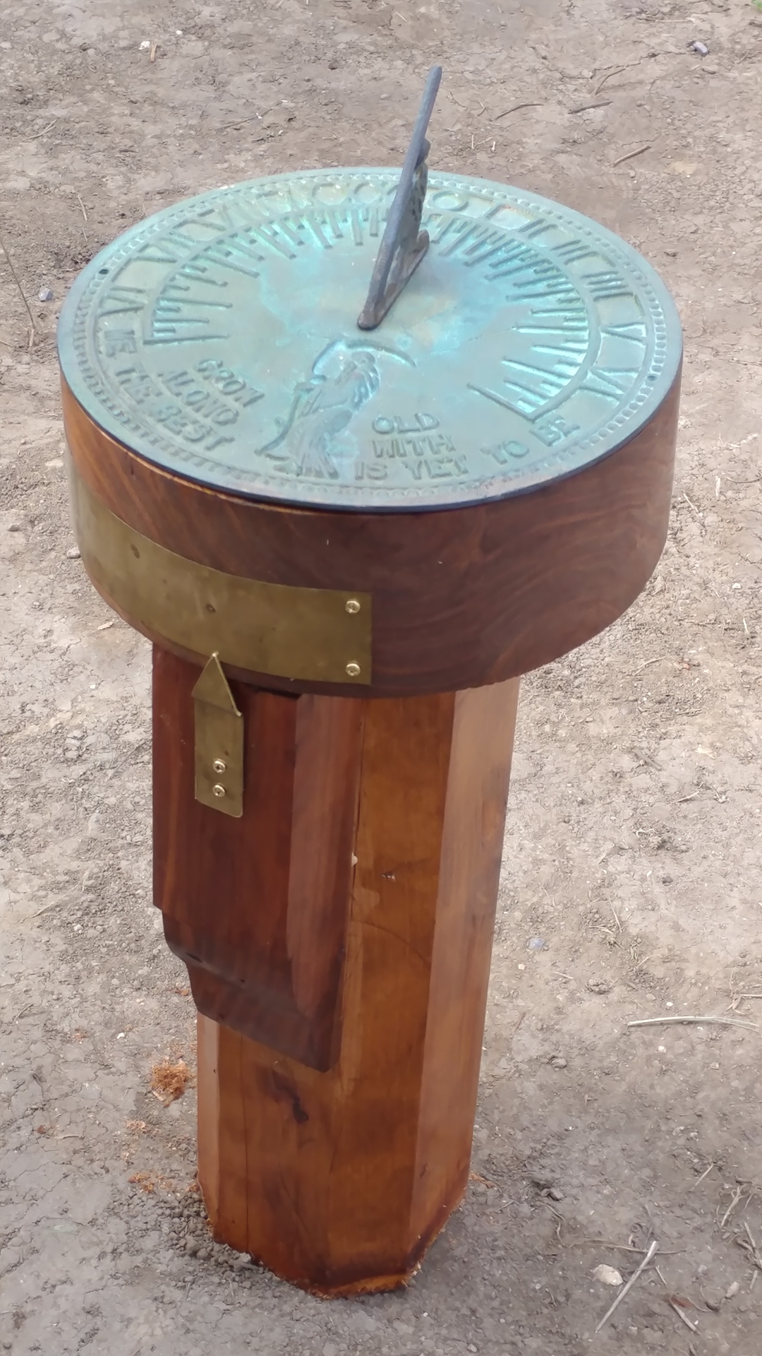 Charlene's dad had this cast bronze sundial that never got put anywhere. I had some redwood. The top can turn, the brass is so that we can note times and angles for seasonal adjustments.