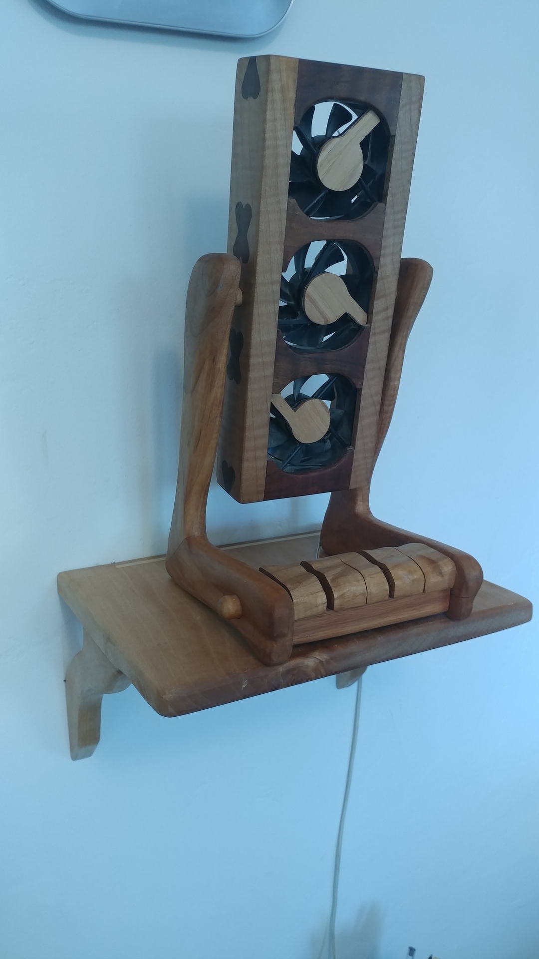 Shelf, installed, with fan (and I finally made covers for the labels on the fan, after years and years) (and the fan is my first attempt at a heart dovetail).