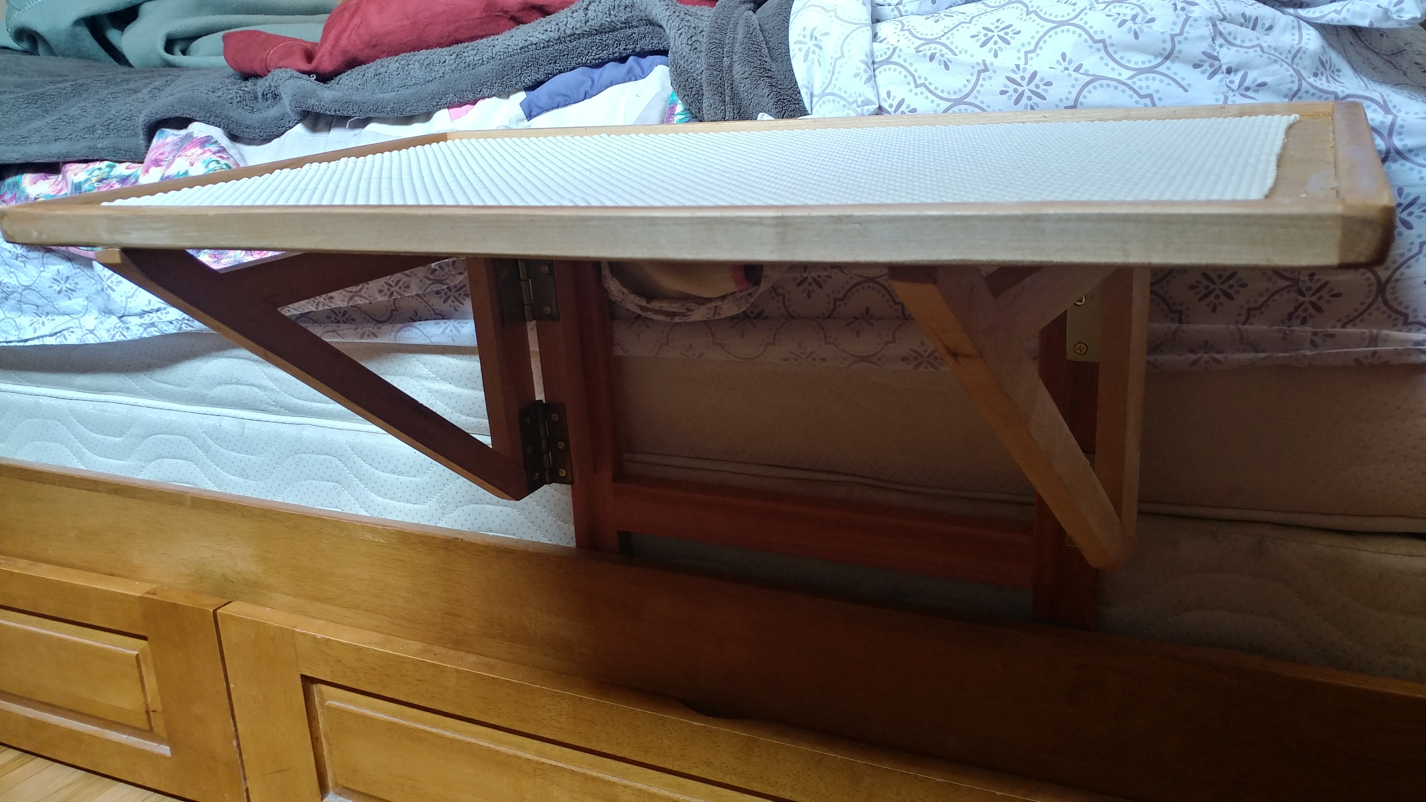 Another recent project: Bagheera likes to sleep on Charlene's pillow, crowding her, so we made this fold down shelf to put a pillow on and shove him into, for more room on the bed.