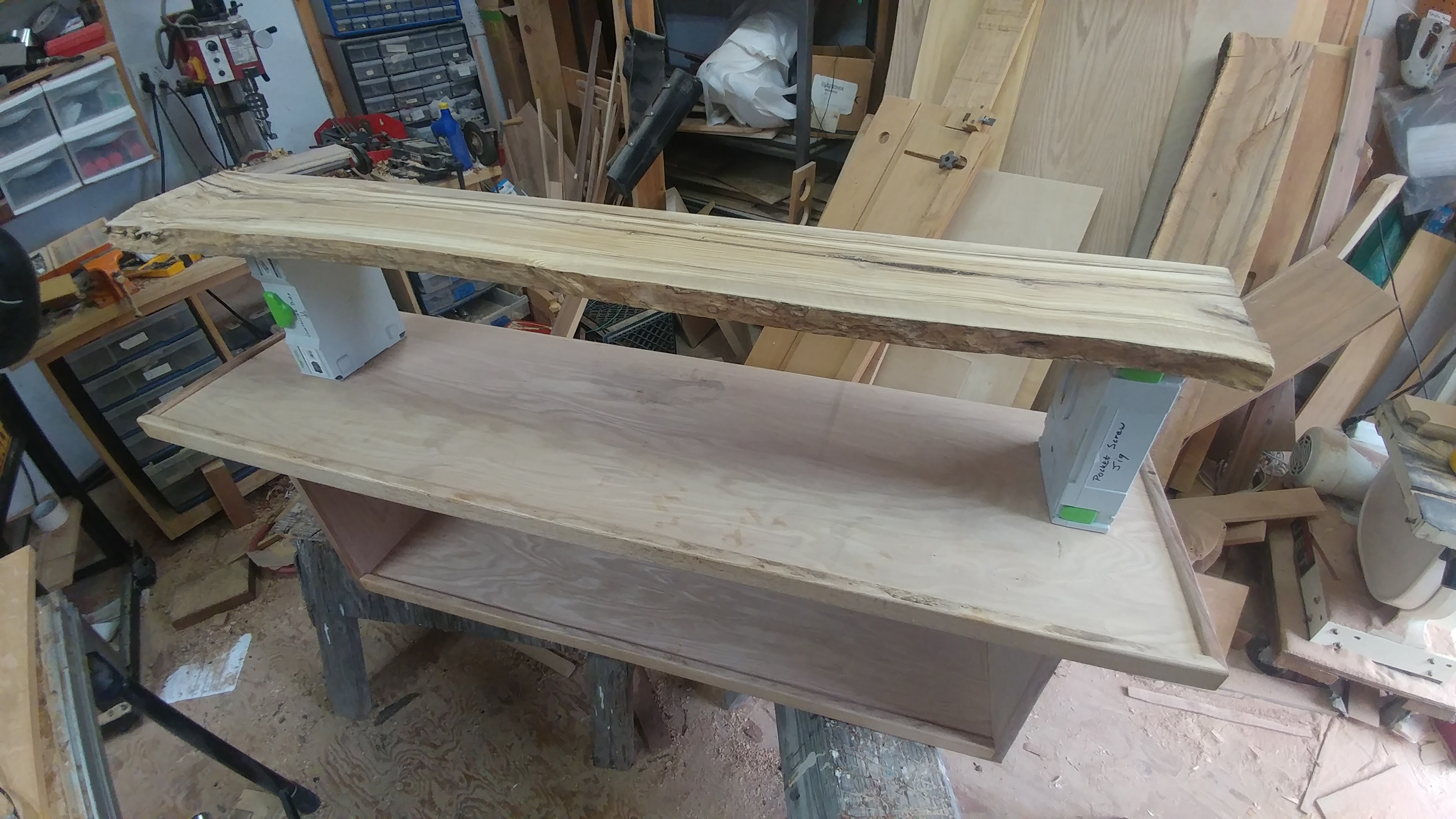 Trying to figure out what the superstructure looks like, 3 sliding doors in the front with panels grain matched to the top olive slab. The whole thing will rise up from the head of the bed with linear actuators to expose the lower shelf.