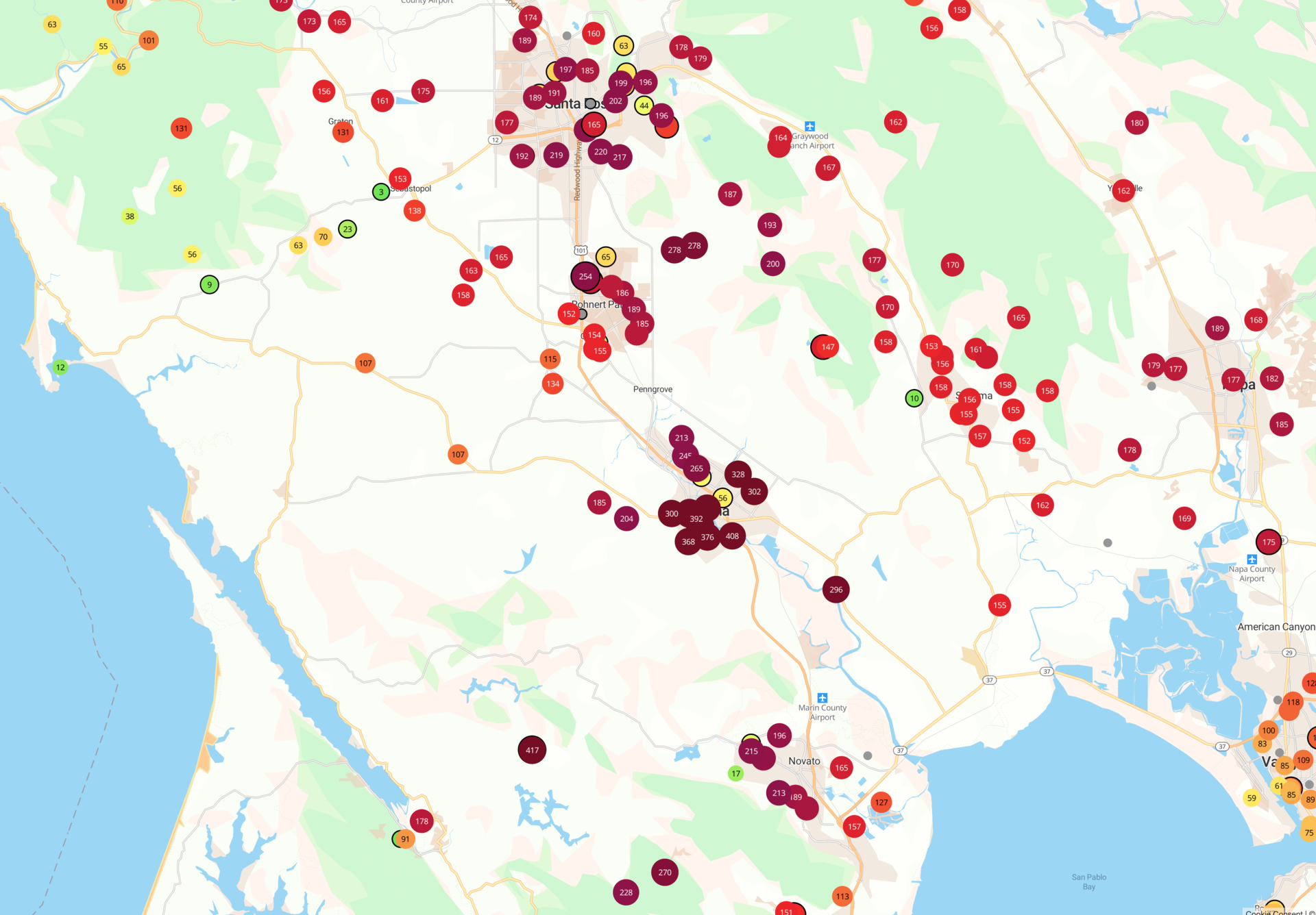 Fuuuu. Well, you can tell where the two indoor sensors are. We should probably get a sensor to add to this cloud. But, yeah, it's freakin' gross down here. Map from https://www.purpleair.com/map?opt=1/mAQI/a10/cC0#10.86/38.2628/-122.7148