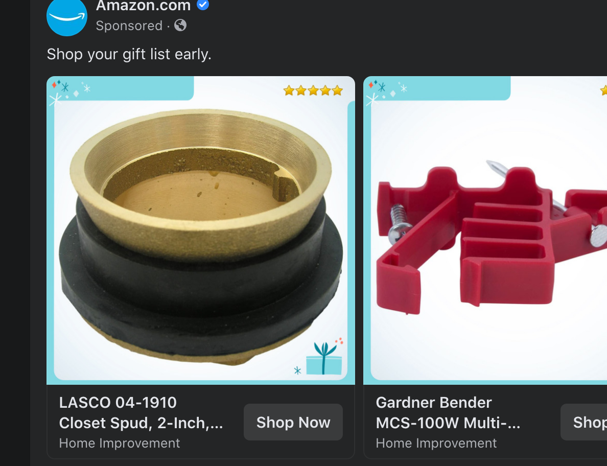 Amazon thinks I should be buying toilet plumbing parts for my gift list. Not sure whether I should be pointing and laughing at machine targeted advertising... or disturbed that I'm so seen.