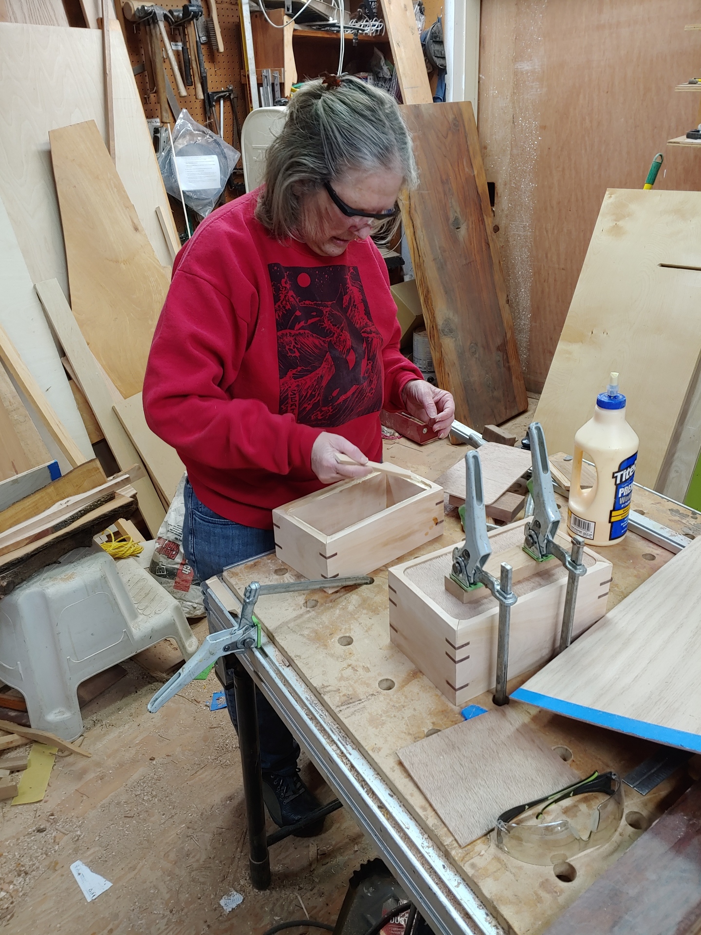 Charlene is making some nice little boxes from... we think it's pear... with Purpleheart keys reinforcing the corner joints.