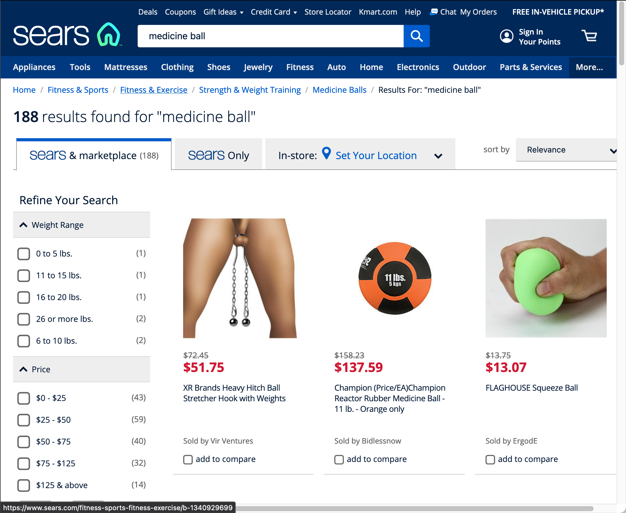 Looks like everybody's trying to compete with Wish these days... Actual search results from https://www.sears.com/search=medicine%20ball right now...