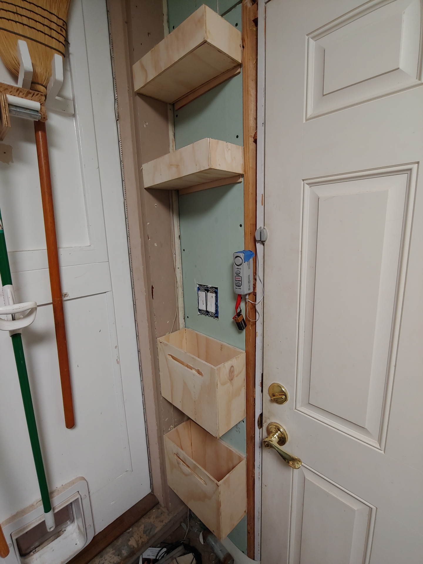 Stuff gathers by the back door to go out to the shop, so I hung some boxes on French cleats to help organize that (with picture this time)