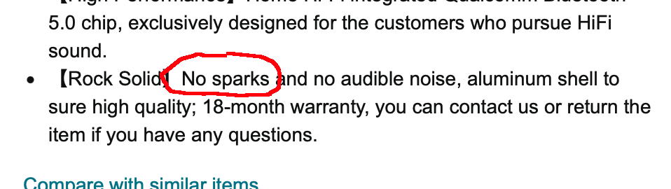 Friend recommended these amplifiers to me, and I've gotta admit I'm pretty impressed by truth in advertising. This one proudly boasts "no sparks"!
