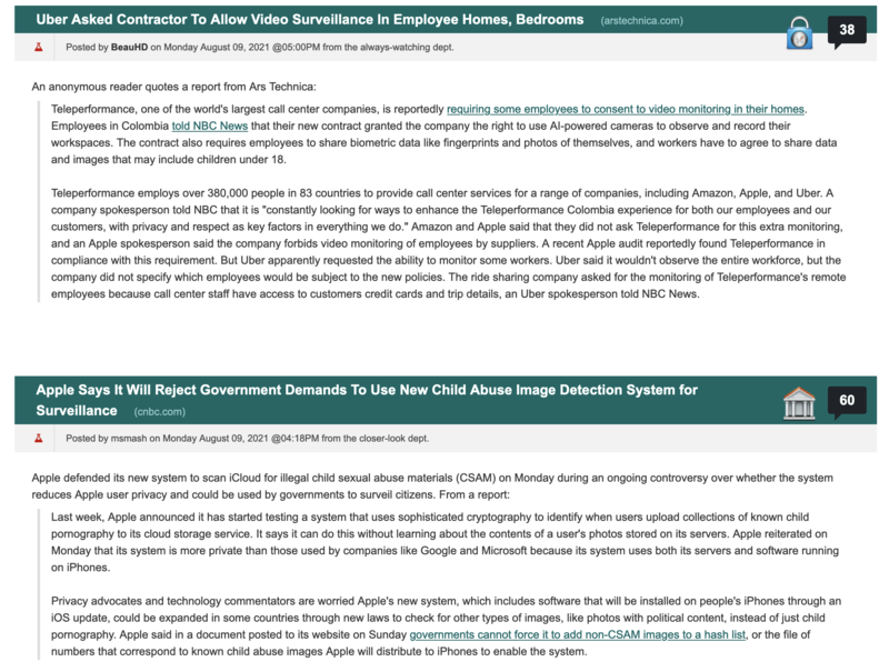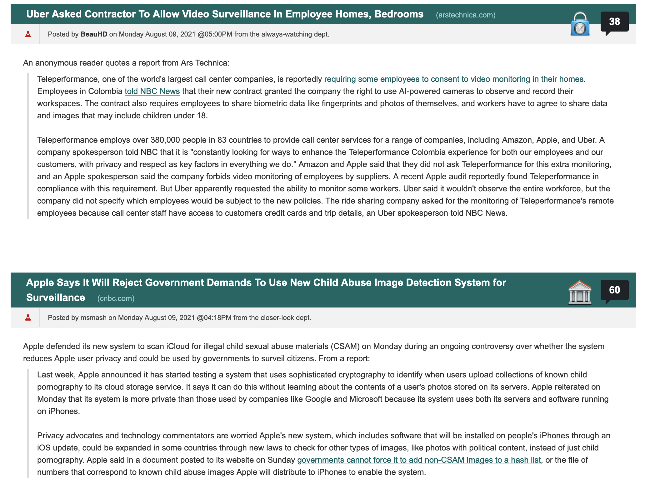 Sorry for the extreme blast of screen-grabbed text, but I thought the juxtaposition of Uber surveilling employees inside the home and Apple assuring us that they'd push back on surveillance requests important...