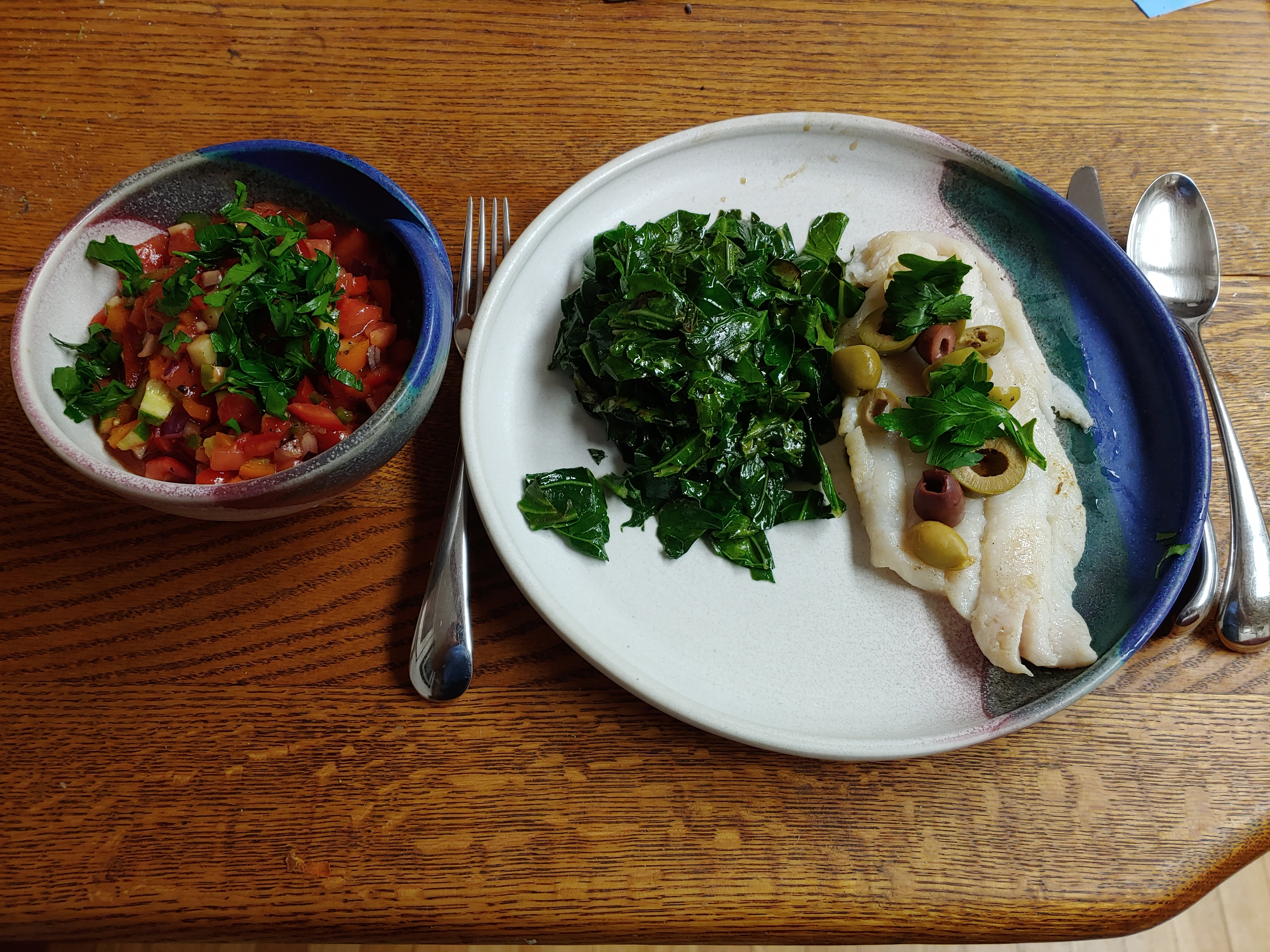 Cooking for one tonight: a crude gazpacho made with tomatoes and cucumbers from a neighbor, collards from my voice teacher, and a little sole topped with a medley of olives.