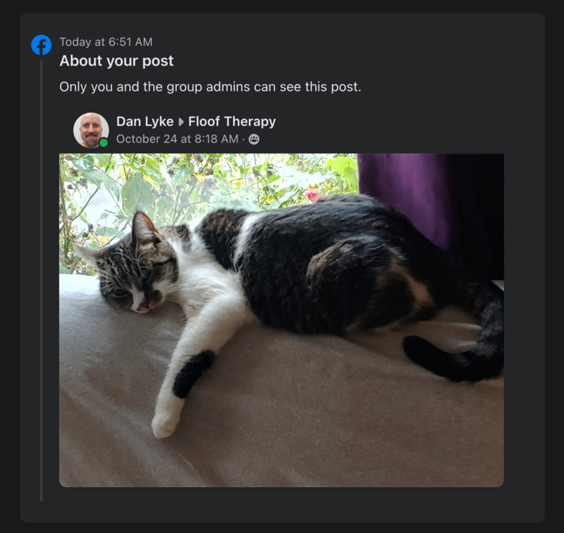 Facebook, out there protecting the readers of Floof Therapy from the spam that is my cat.