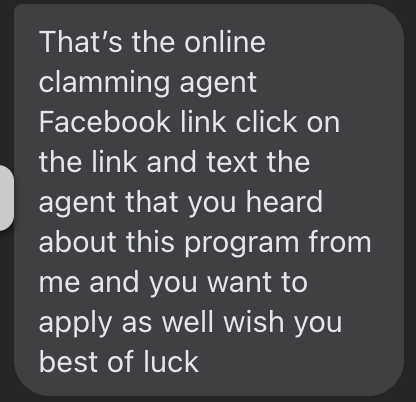 Facebook scammer trying to get me to chat with an "online clamming agent"? Who knew that seafood and some sort of assistance grant went together?