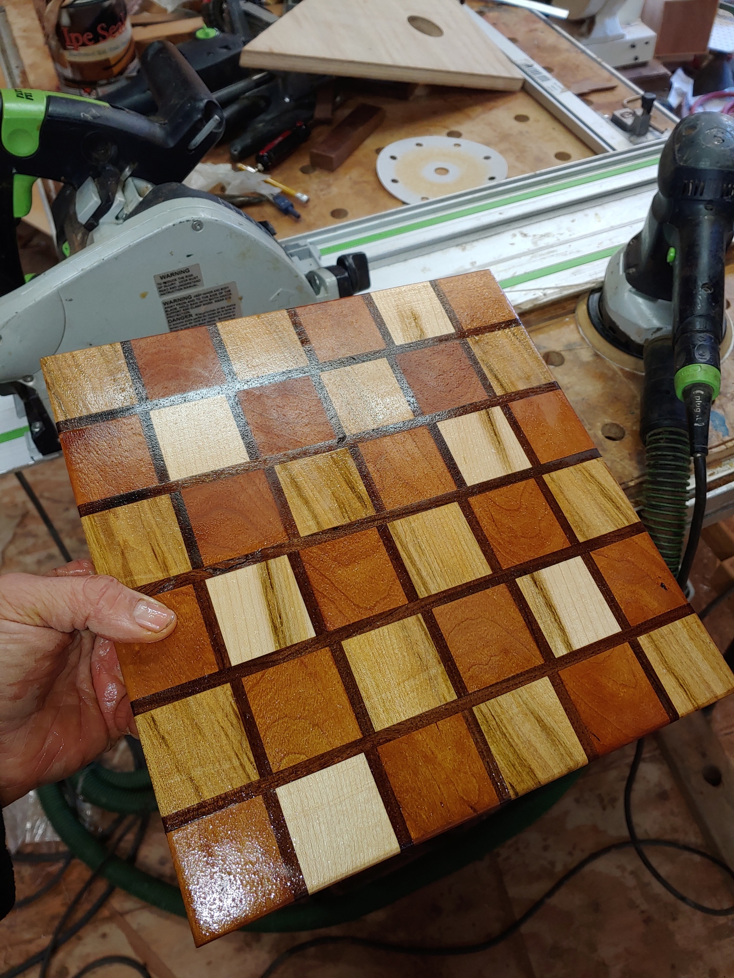 Just using up scraps and replacing a cutting board that fell apart after two decades. Maple, cherry, and walnut.