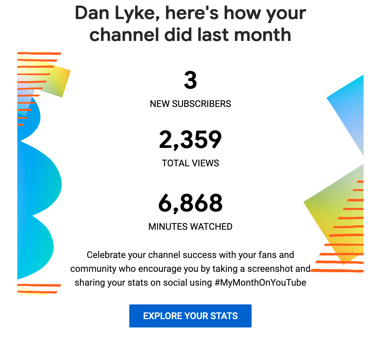Woohoo! 3 new subscribers! 6,868 total minutes watched! 2,359 total vie... oh, if my videos generally run an hour or two, that means... uh...