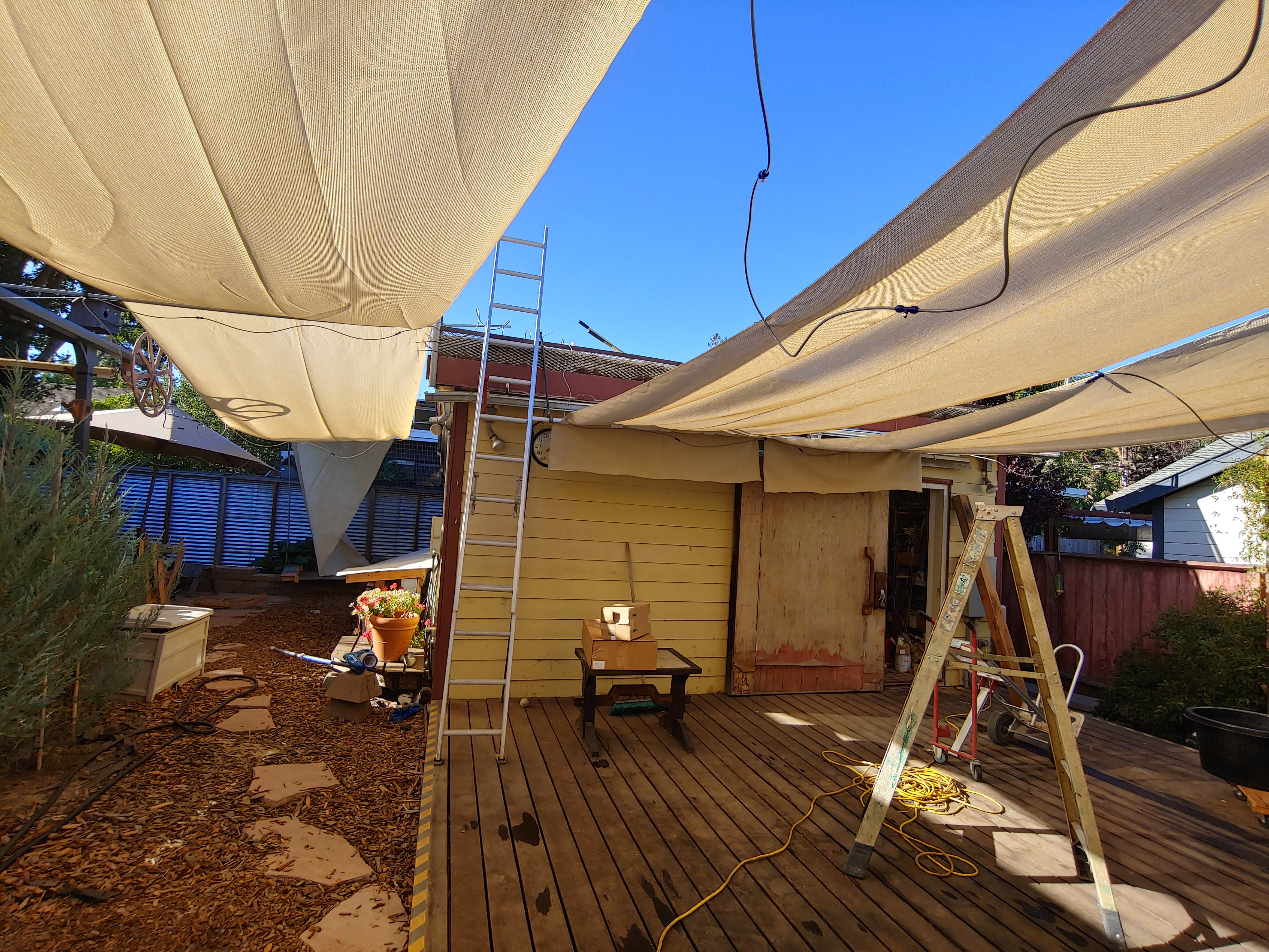 Neighborhood pot luck this afternoon. Heat wave. Time to Burning Man this place up with misters and shade cloth. Now with picture.