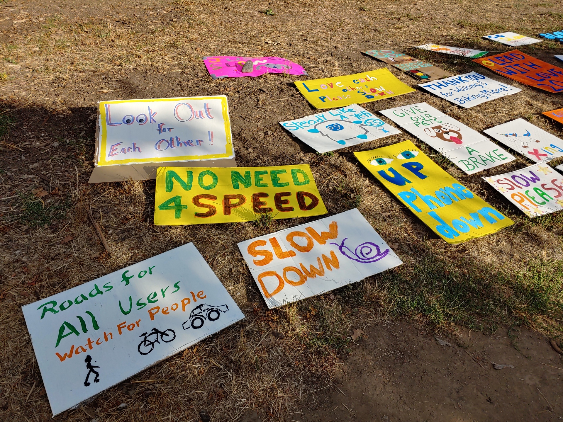 Neighborhood sign making part in preparation for bike and walk to school day...