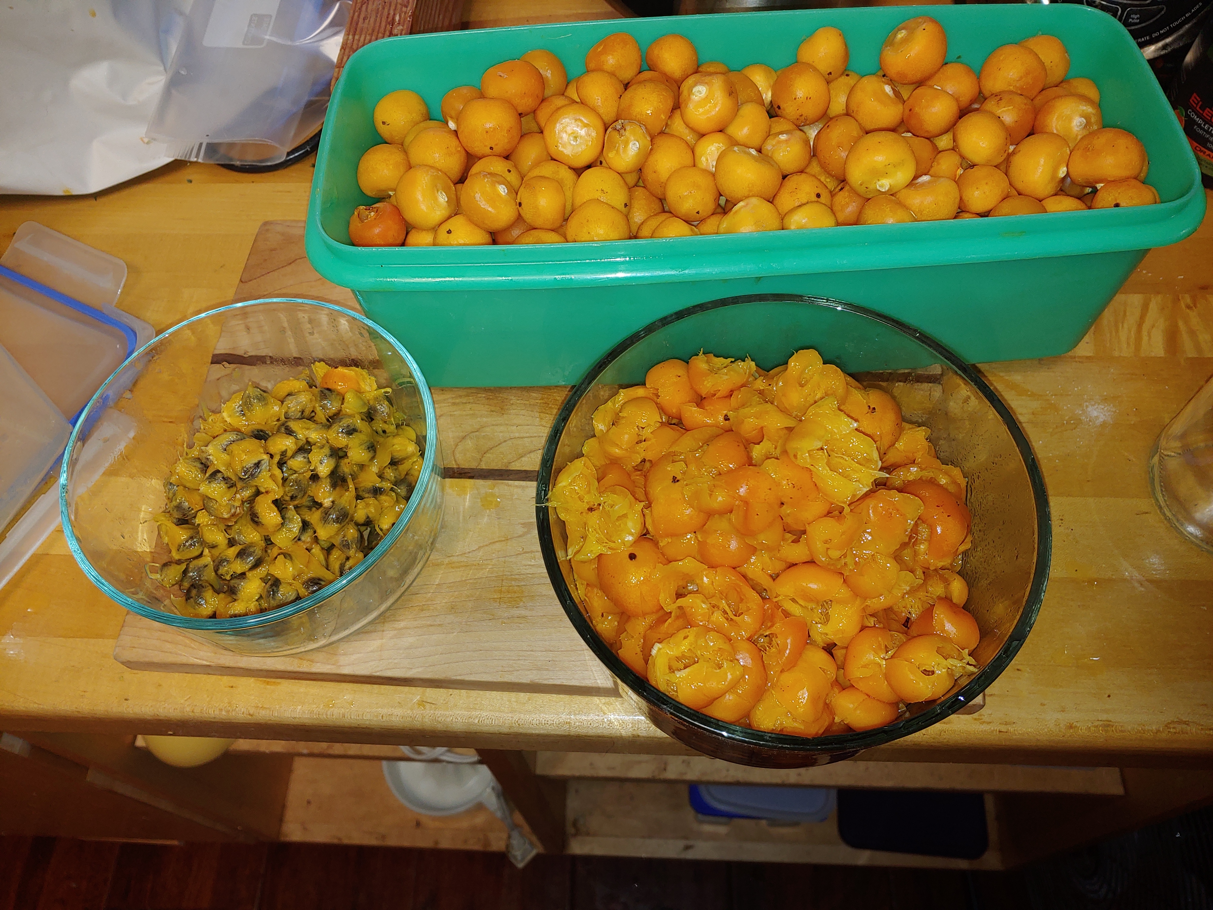 Pitting the Pindo fruit. The freezer is filling up. Some time this week I'll have to rack the plum wine, start this fermenting, and figure out where I'm gone stash a few more carboys for fermentation.