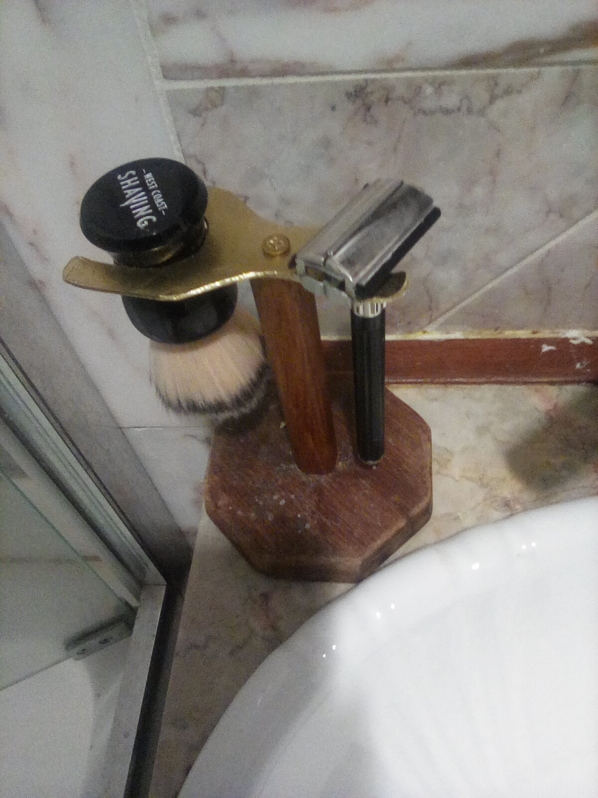 I bought a shaving brush holder a while back, and the bottom rusted out, so I replaced it, and the plating on the post was peeling and my new brush didn't fit, so tonight I abused some brass on the scroll saw and replaced the vertical with wood.