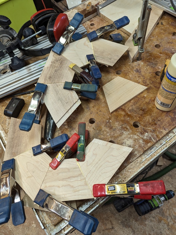 Fucked up my third attempt at this fan louver, so decided that gluing up a solid piece and trying to rout it out was a bad strategy. Trying lapped pieces for the face this time.