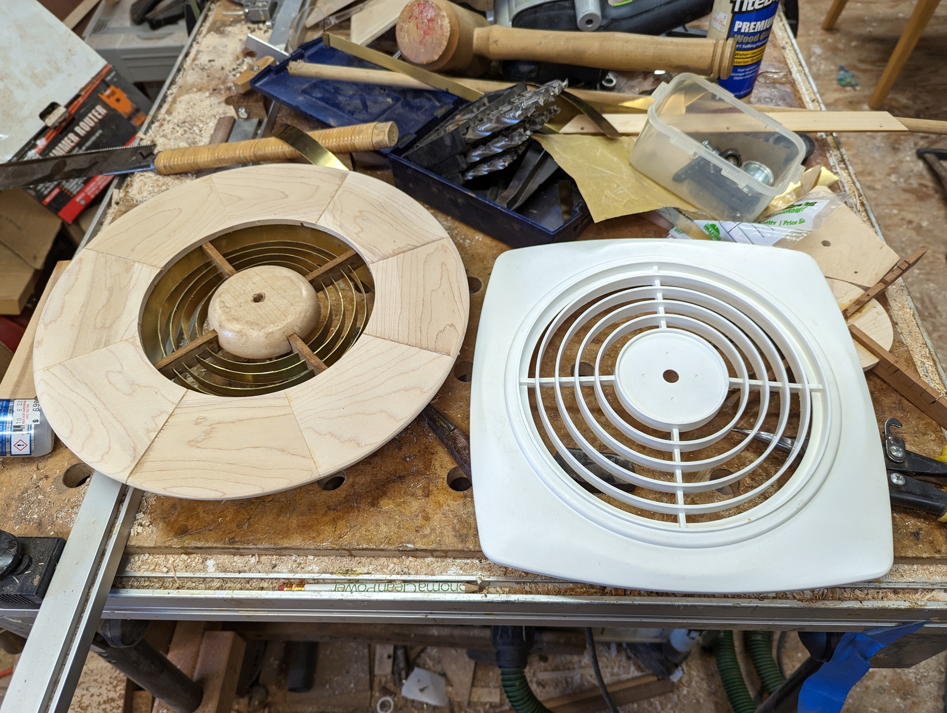 This has been one hell of a project so far. The intent is to replace that ugly plastic vent fan louver with something more appropriate to the space.