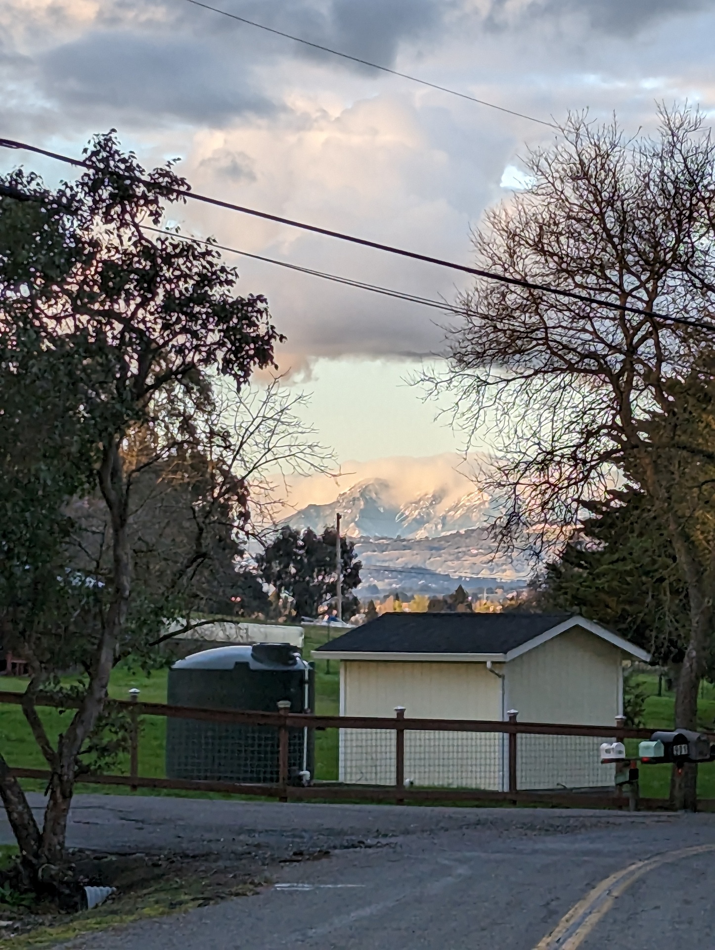 Driving to my voice lesson, no real good place to stop and get a picture of the snow covered mountains to the north, maybe Mount St Helena? But it's amazing to have the snow part all day, and to have it this widespread.