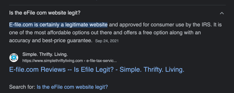 Brian Krebs toot about efile.com serving malware at https://infosec.exchange/@briankrebs/110136163317989884 made me try to figure out what it was. And, yeah, a gazillion content farms telling Google that of course it's legit. I'm trying to figure out how to explain the "IRS E-file" vs "efile dot com" situation to my elderly friend whom I sent the "no, you can use the IRS web site for free" link a few days ago.