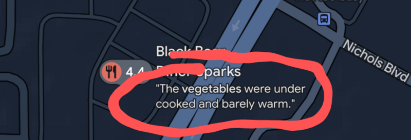 Asked Google Maps for a restaurant near me that had vegetables, and it delivered... "The vegetables were under cooked and barely warm". Uh....