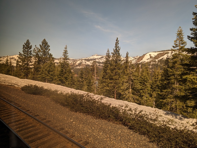 Donner Lake, kinda, through the trees, while we wait for an eastbound freight train. And dang it, auto-corrupt, it's "Donner", not "Dinner". (Now with picture)