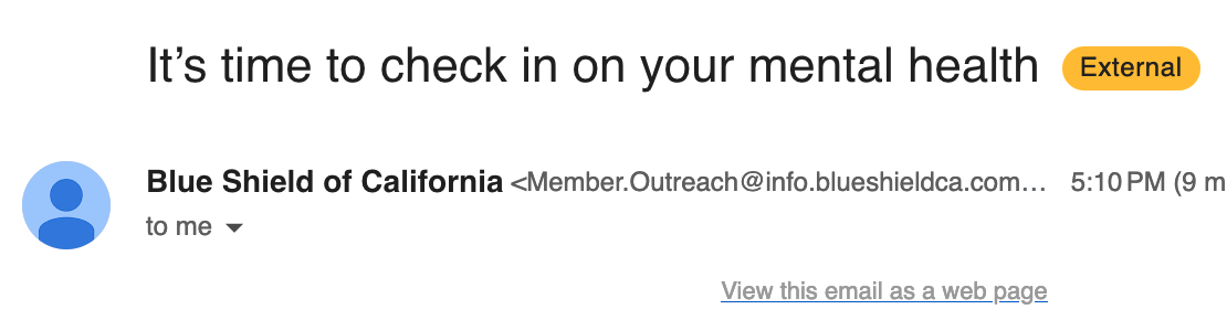 BlueShield email suggesting that "It’s time to check in on your mental health", and no, no, I don't think it is. I. Am. Fine. Thankyouverymuch.