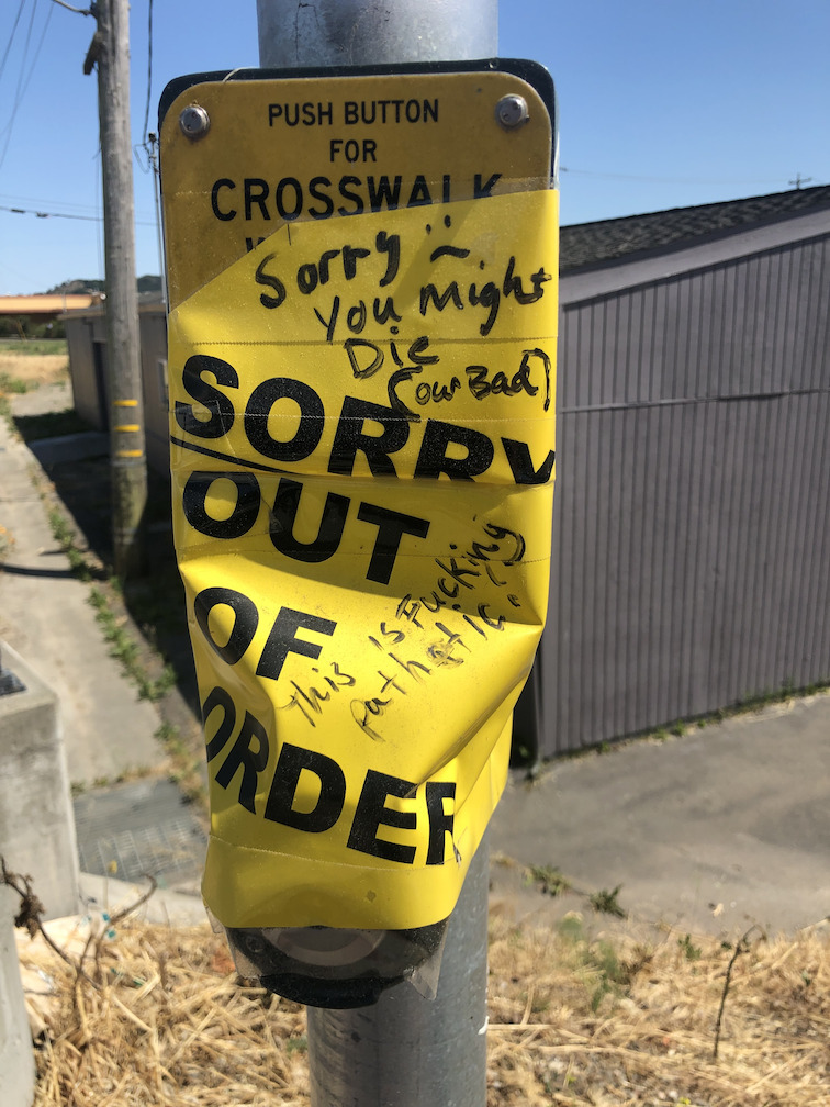 Why Rectangular Rapid Flashing Beacons (RRFBs) at crosswalks are a bad freakin' idea that normalize drivers being even less attentive. I do appreciate the extra wording on the "sorry out of order" taped over beg button: "sorry, you might die, our bad" is, yeah, how we treat pedestrian and bike infrastructure. (Lynch Creek Trail & Lakeville Highway, Petaluma)