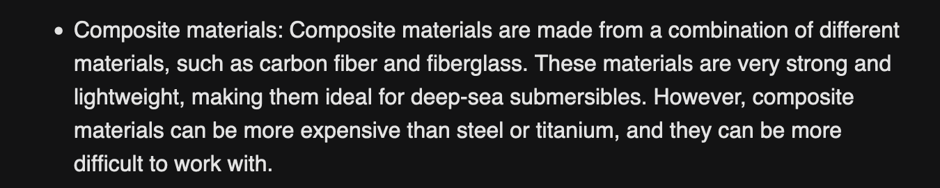 After asking Google Bard for a list of primes ending in 2, and being told that 5 was one of them, I asked it "What are good materials to make deep sea submersible pressure vessels out of?", and yeah, on-brand. I mean, it did suggest steel and titanium first, but we may have an insight into a design process now.