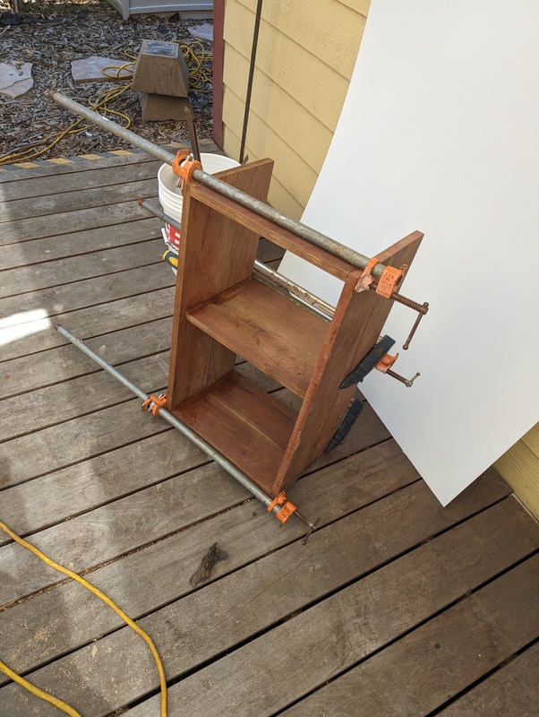 Carcase glue-up for out little library, needs the back, and then carving, and then a roof that lives up to it (some scrap brass, interesting roofline).