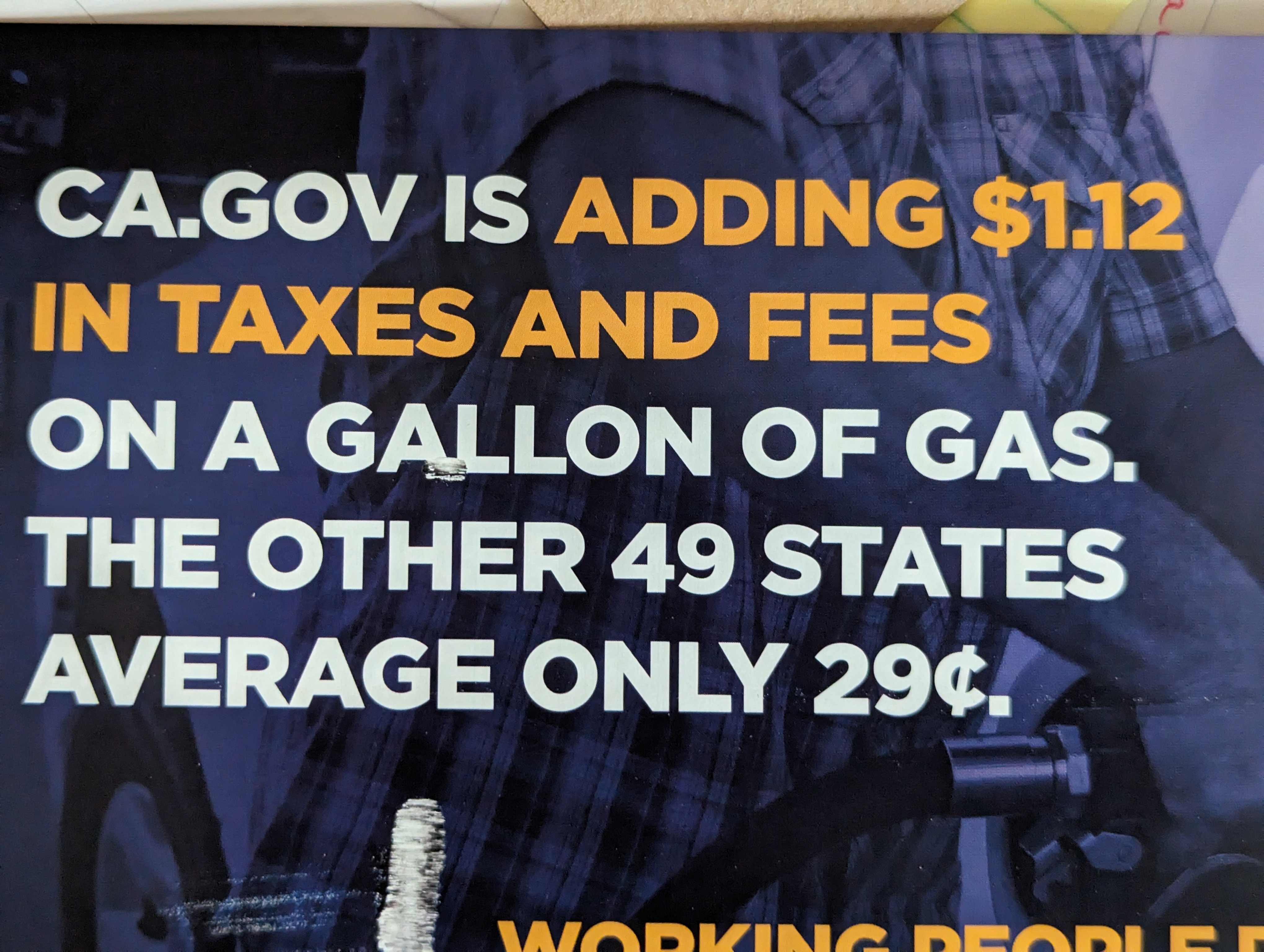 The flyer whines "CA.gov is adding $1.12 in taxes and fees on a gallon of gas. The other states average only 29¢." I'm not gonna give these assholes, "Californians for Affordable and Reliable Energy", a link, but holy shit yes and it should be $11.20 and fuck off you climate destroying petroleum industry shills.