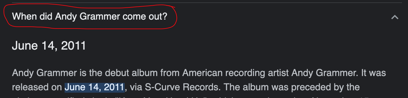Some day, Google will make the quick results headlines relevant to the context of both the question and the answer. Today is not that day. Though, I admit, I did click to open this one because I was kinda surprised at the implication of "When did Andy Grammer come out?" (For those unable to read the image, it's an excerpt of the Wikipedia page about the album of the same name.)