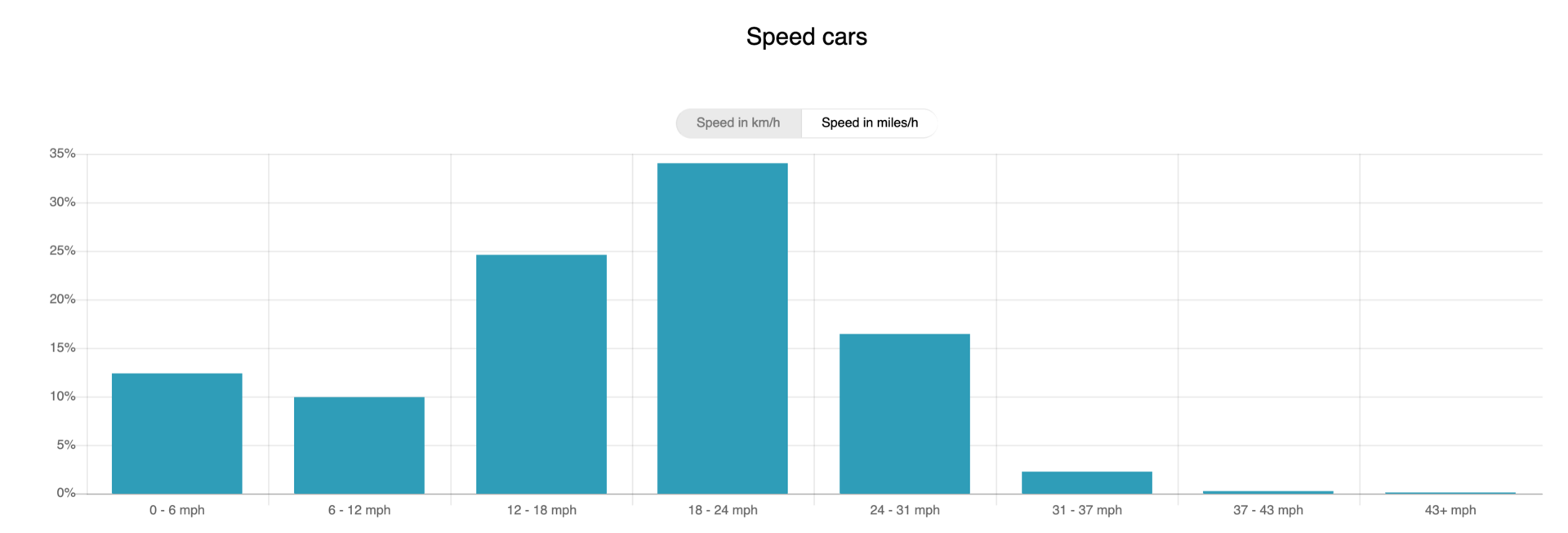 First data from the Telraam traffic counter is in. To put that 43+ MPH speed in context, the device is maybe 150' from the stop sign. That 85% of the traffic is at the speed limit that close to the intersection is pretty telling, and we really need some counting up the street...