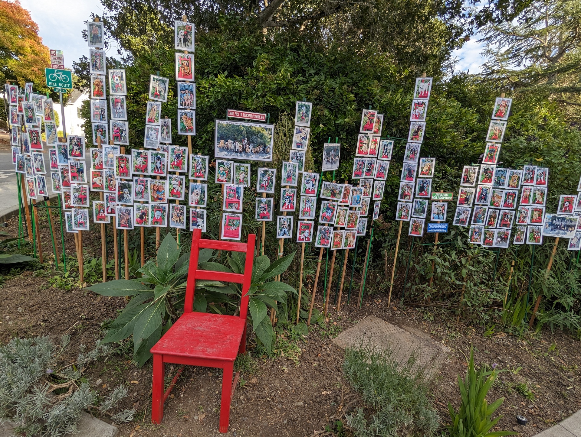 Red chair, surrounded by pictures of pets and kids on the chair. I St & Grant Ave.