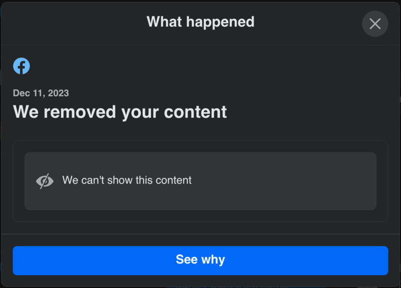 Facebook told me it removed my content. The preview says "We can't show this content". I, of course, contested the removal, and when asked why I posted it said that "the issue is important to me", but I have no idea what the content was.