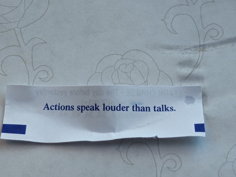 Fortune cookie: "Actions speak louder than talks." A gazillion TED speakers just went mute...