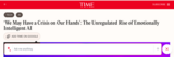 Time Magazine article titled "‘We May Have a Crisis on Our Hands’: The Unregulated Rise of Emotionally Intelligent AI" offering a chatbot with "ask me anything" placeholder text...